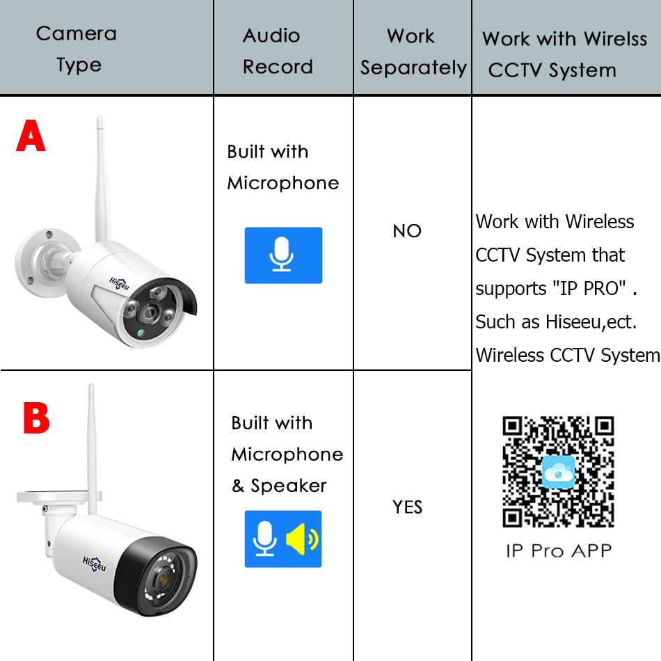 Type B IP Camera not only works by itself, but also works with the Hiseeu Wireless NVR Kits (Type B Camera built with microphone and speaker, Type A camera only built with microphone).